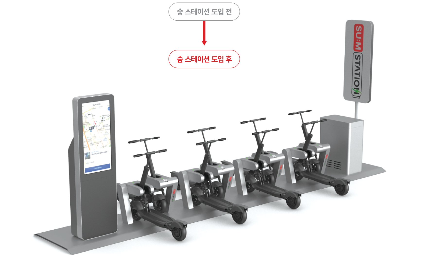 SU:M STATION은 배터리 교체 또는 크라우드 소싱 솔루션보다 현저히 낮은 비용과 통합 잠금 및 충전 시스템을 도입해 충전 중 안전을 위해 잠금 해제가 불가능하게 만들어 무질서한 주차로 인한 사고방지, 지정된 주차공간의 대중인식, 안전하고 질서 있는 퍼스널 모빌리티 사용자의 환경을 제공